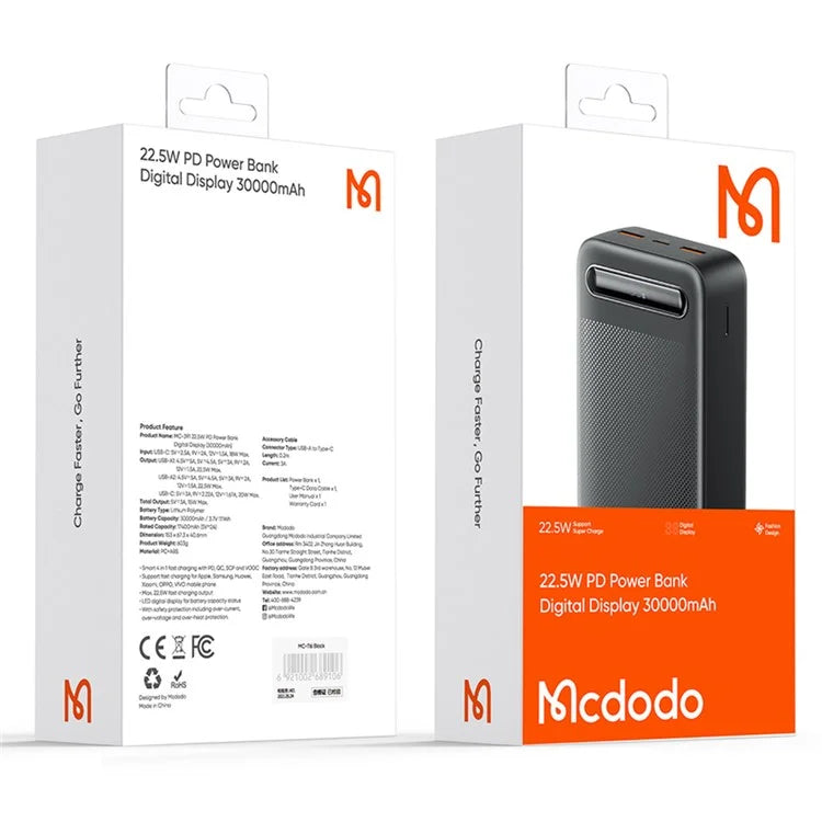 The MCDODO MC-391 is a robust 30000mAh portable power bank built for power users, travelers, and heavy mobile users. With dual USB outputs, PD fast charging up to 22.5W, and a digital percentage display, it ensures your devices stay powered longer and safer — anytime, anywhere.
